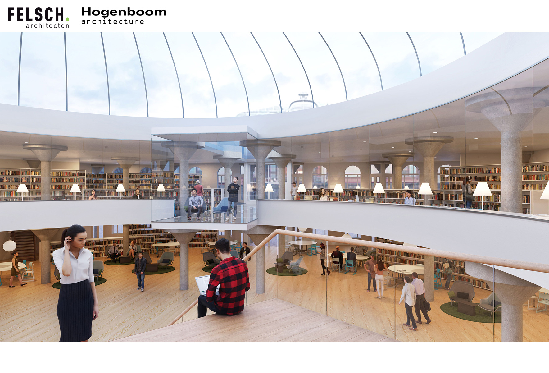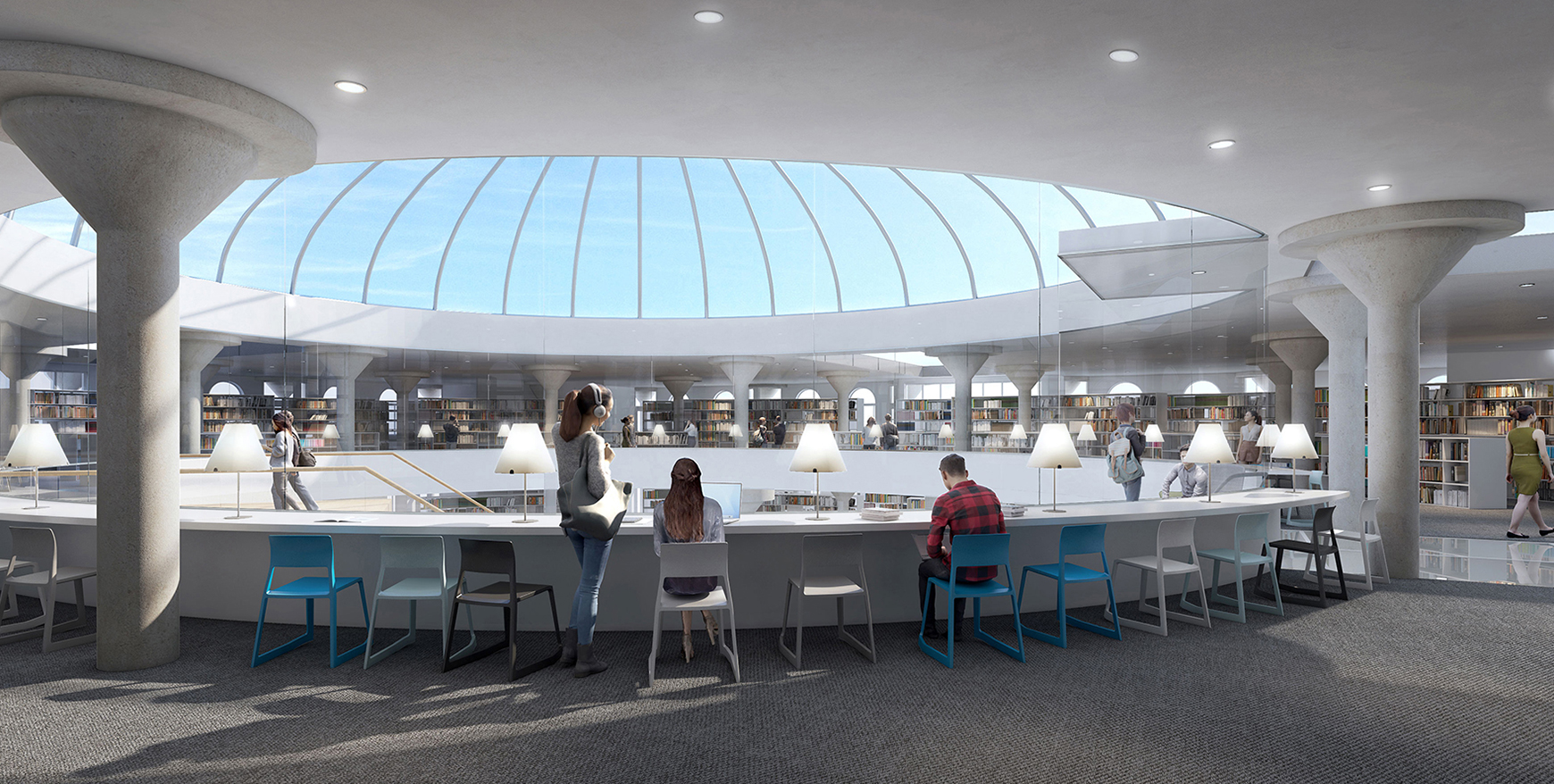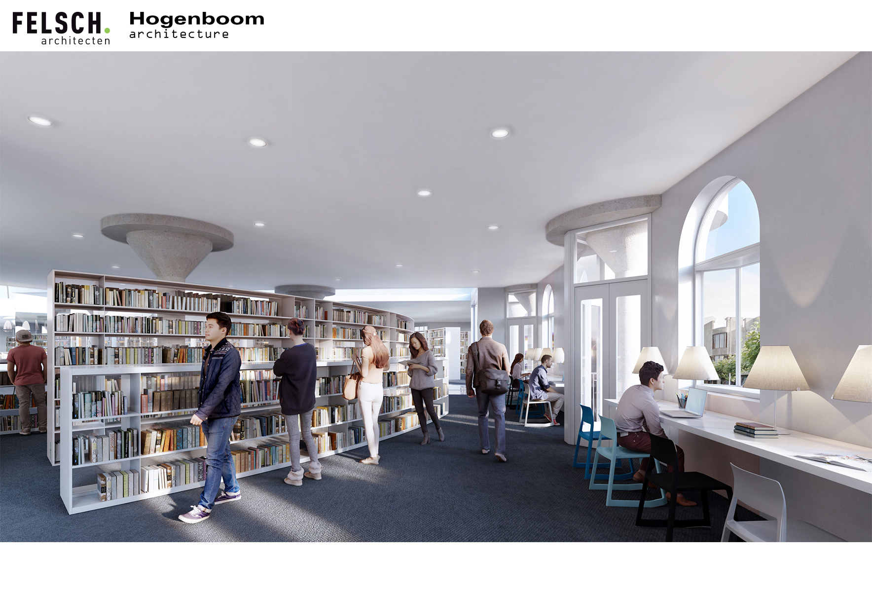 We hebben een studie gedaan naar de transformatie van de faculteit Geesteswetenschappen naar een uitbreiding van de Bibliotheek in Leiden voor de Middle Eastern Library. De kenmerkende structuur van het gebouw met de grindbetonnen paddestoel kolommen is behouden, evenals de grillige buitengevel. Aan de binnenzijde is de binnenplaats overdekt met een glazen atrium dak, en heeft de eerste verdieping een ronde vloerrand gekregen.Op de begane grond bevinden zich ontmoetingsplekken en informele werkplekken. Vanuit het nieuwe atrium stijgt een royale trap als tribune naar de eerste verdieping. Hier bevindt zich de collectie rondom het atrium met aan de randen werkplekken met uitzicht naar buiten en op het atrium.